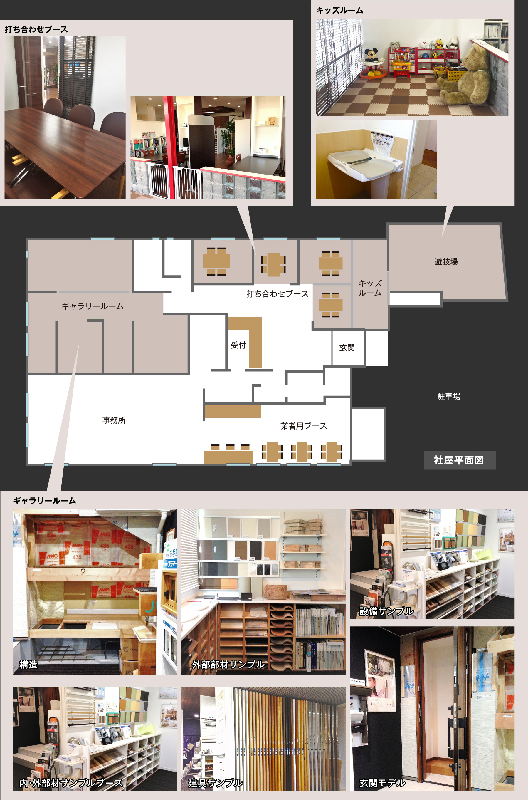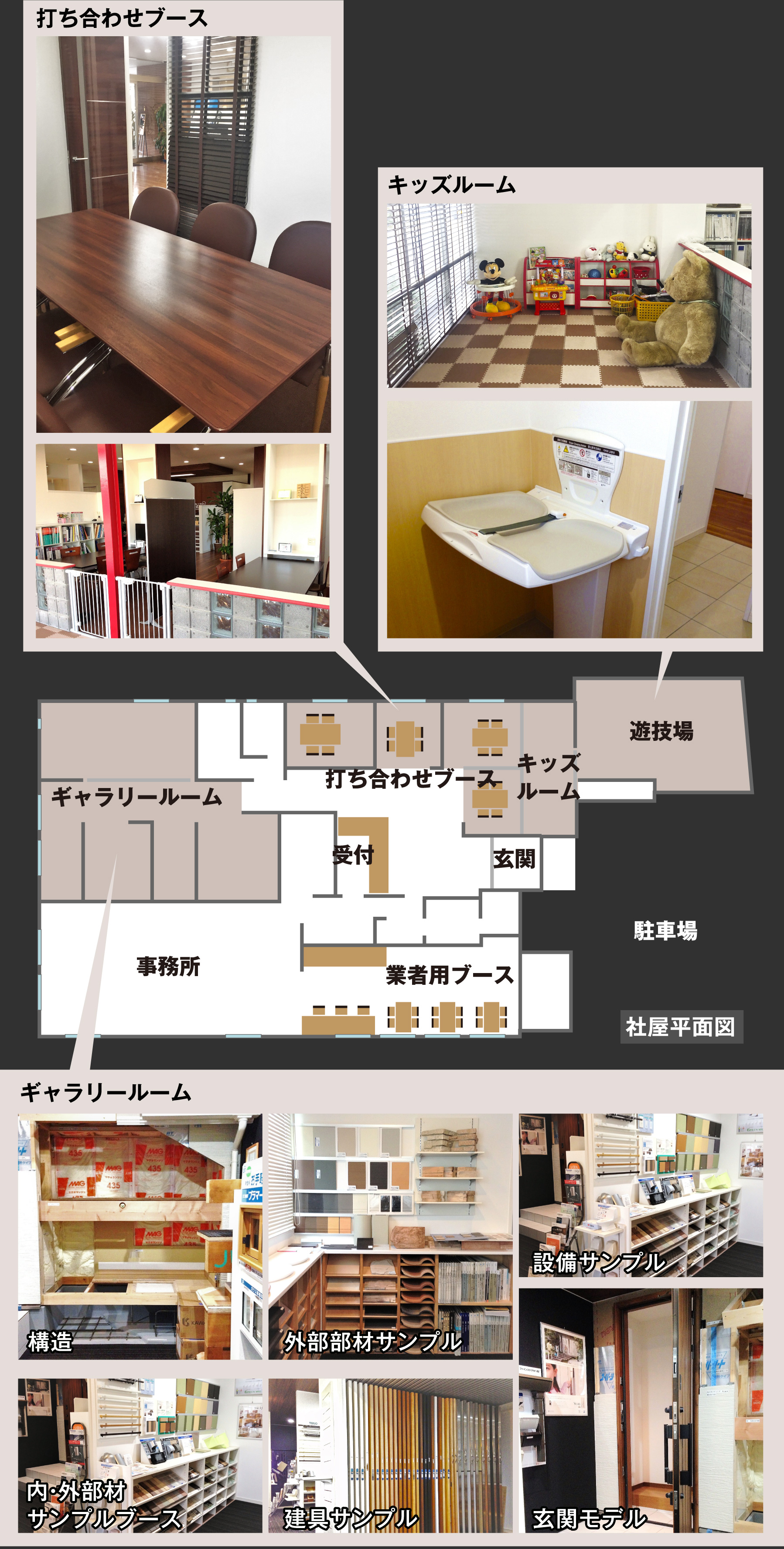 吉田建設のギャラリールームでは、断熱・耐震性能や外装・内装仕様の素材を実際にご覧いただけます。キッズルームも完備してますので、お子様連れのお客様もゆっくりお打合せしていただけます。